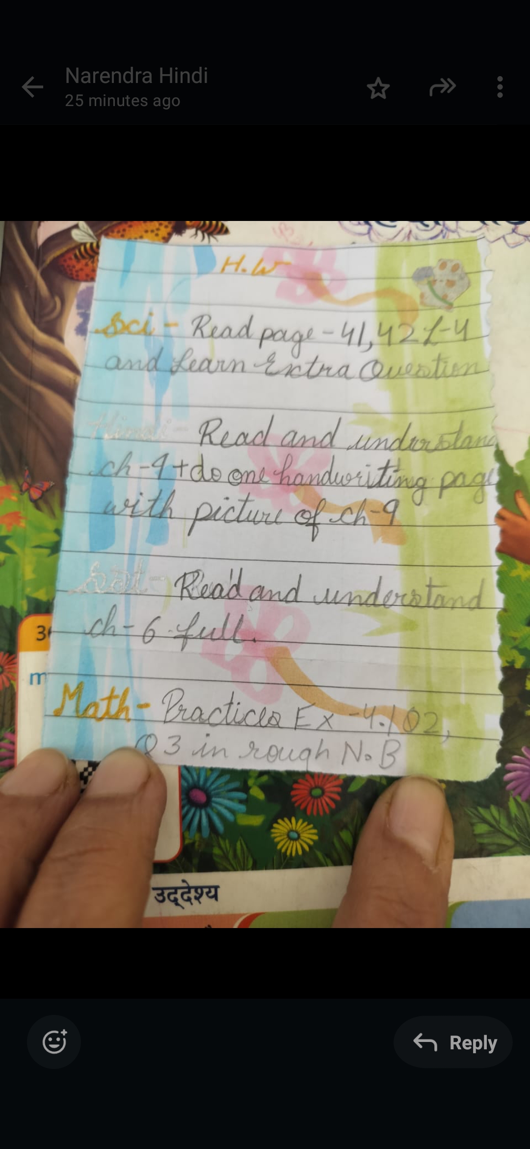 *Hindi* - Write one hand writing page with picture + ch- 9 for reading test
